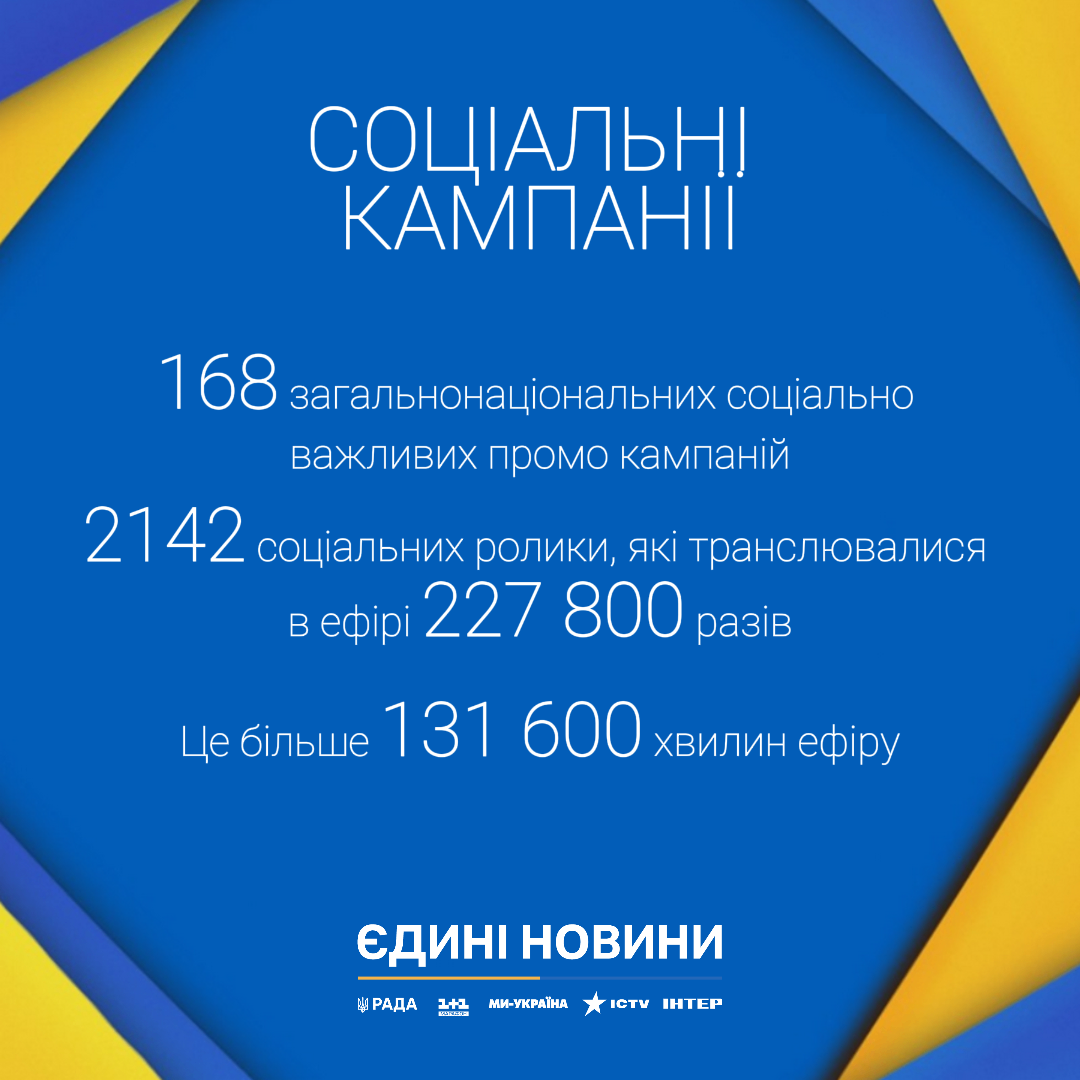 За 3,8 роки в ефірі національного телемарафону було реалізовано комунікацію 168 загальнонаціональних соціально важливих промо кампаній. Зокрема, підтримка економіки: сплата податків; підтримка національного виробника; кампанія «Зроблено в Україні»; «Міста сили»; «Ти як? Програма ментального здоров’я»; підтримка ветеранів; протидія насильству; мінна безпека; евакуація.