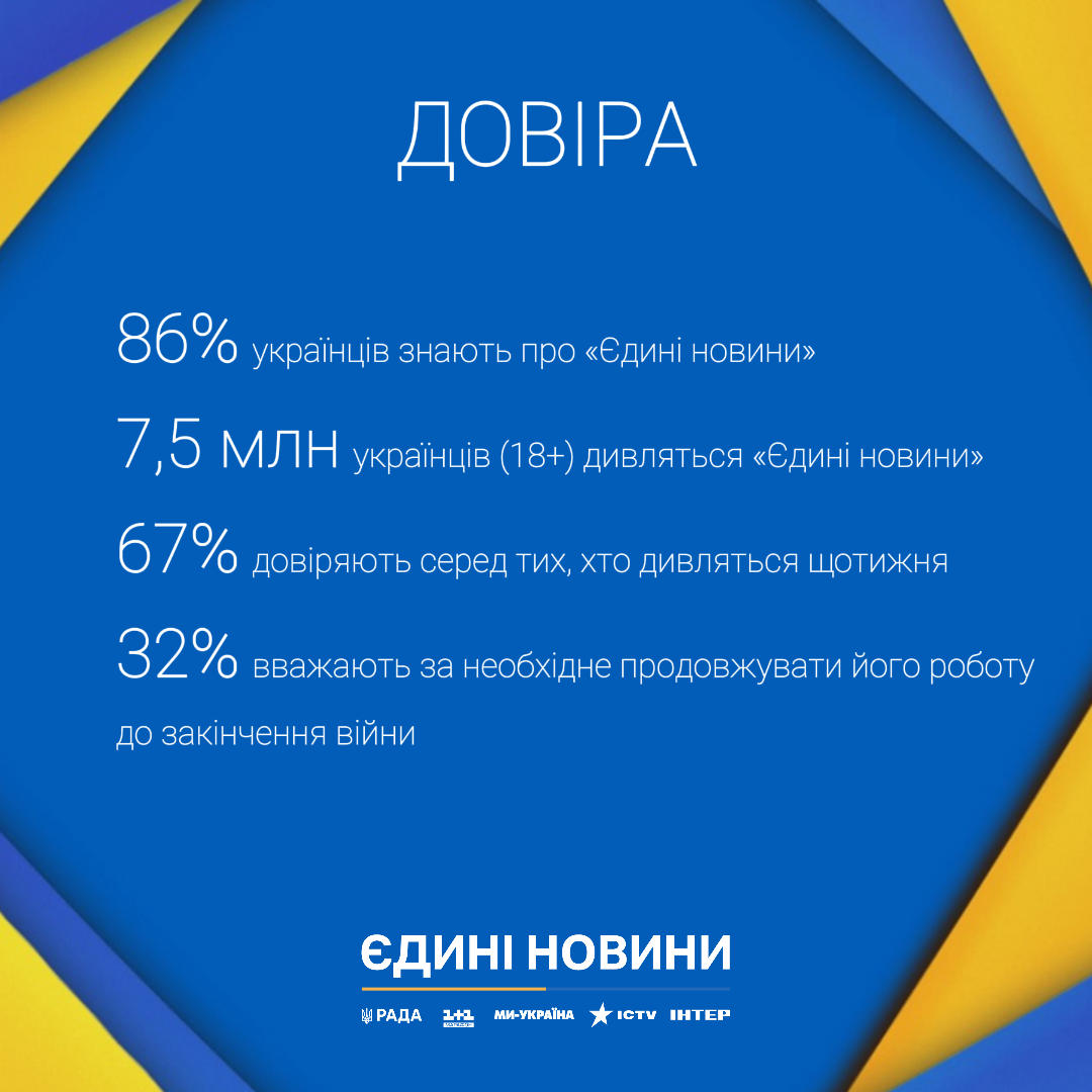 Щотижня телемарафон «Єдині новини» дивляться 7,5 млн українців віком від 18 років, піврічна частка проєкту становить 6,5% (18+, міста 50 тис.+).