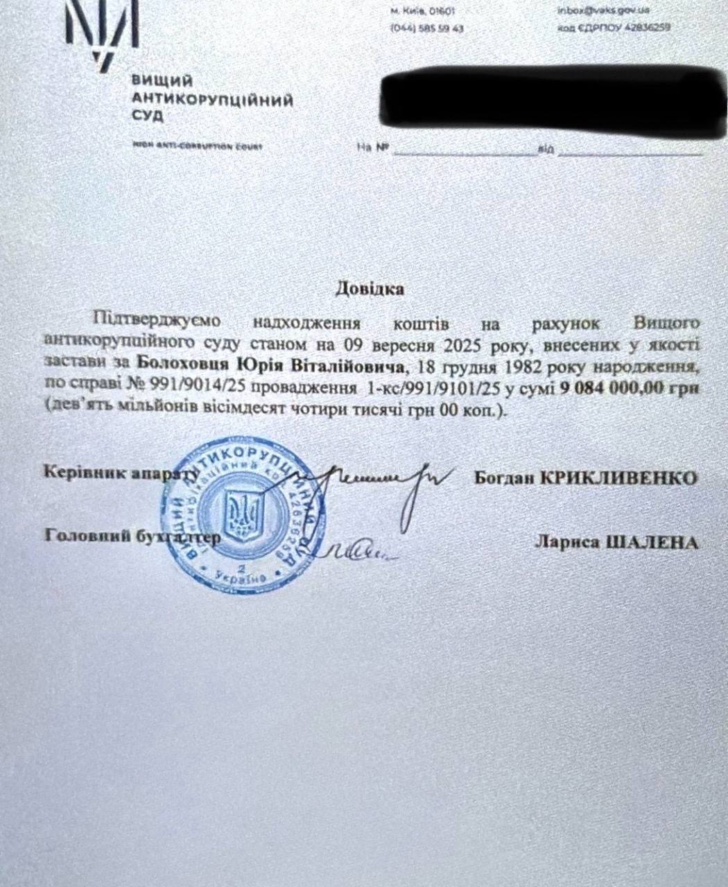 За даними видання СТОПКОР, Вищий антикорупційний суд (ВАКС), задовольнивши клопотання адвоката Болоховця, суттєво зменшивши суму застави. Її розмір знизили одразу удесятеро — до 9,1 млн грн. Це рішення фактично відкрило шлях до звільнення посадовця.