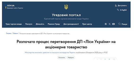 2. «Трирічна реформа галузі: ДП «Ліси України» стане акціонерним товариством», видання Апостроф (https://apostrophe.ua/ua/news/economy/2025-09-26/tryrichna-reforma-galuzi-dp-lisy-ukrayiny-stane-aktsionernym-tovarystvom/352516);
