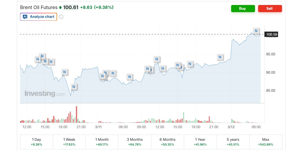 Нафта марки Brent знову перетнула позначку у 100 доларів, додавши до вартості 8,88%. Американська WTI також зросла і нині торгується по 95 дол.