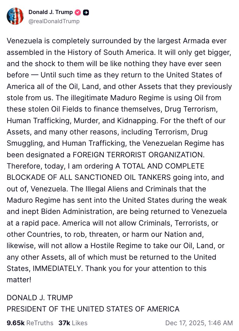 "Венесуелу зусібіч оточили безпрецедентні за масштабом військово-морські сили, чого в історії Південної Америки ще ніколи не було». І цей тиск тільки посилюватиметься, доки вони (мається на увазі режим Мадуро, – ред.) не повернуть Сполученим Штатам усю нафту, землю та інші активи, які вона украли в нас", - заявив американський лідер.