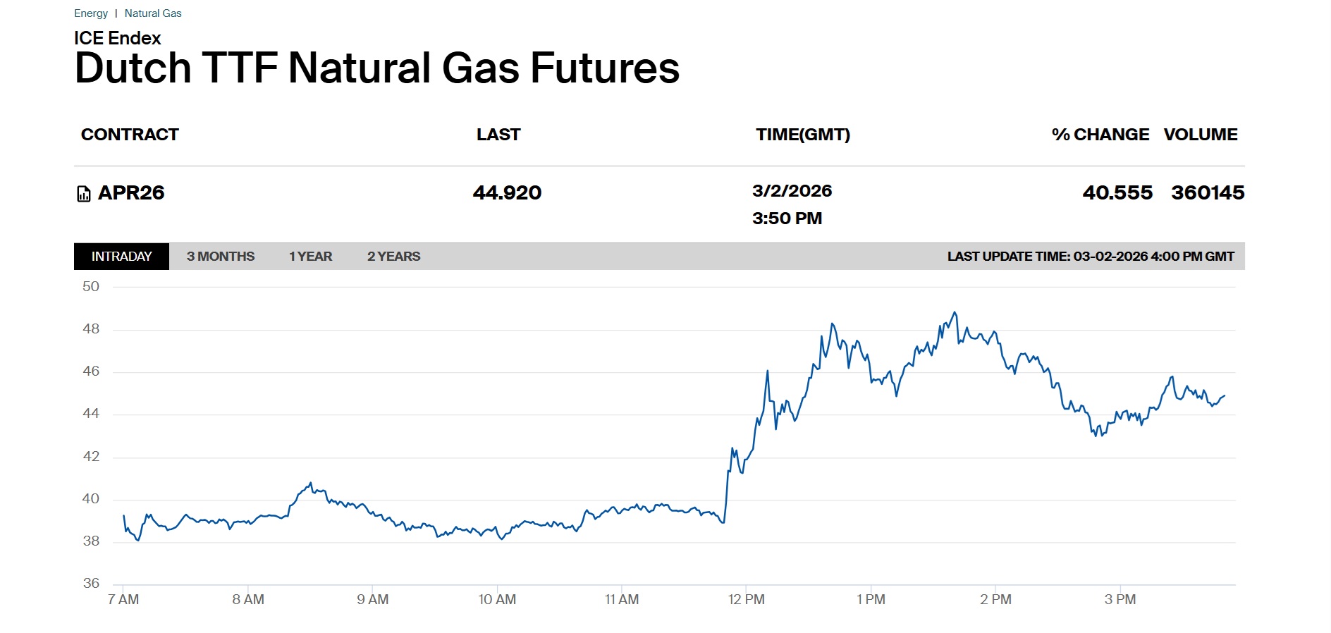 Європейські ціни на природний газ різко підскочили після заяви Qatar Energy про припинення видобутку на тлі атак іранських дронів. На тлі цього квітневі ф’ючерси на хабі TTF зросли на 46%, до 46,55 євро за МВт·год, що стало одним із найсильніших стрибків з часів енергокризи 2022 року.