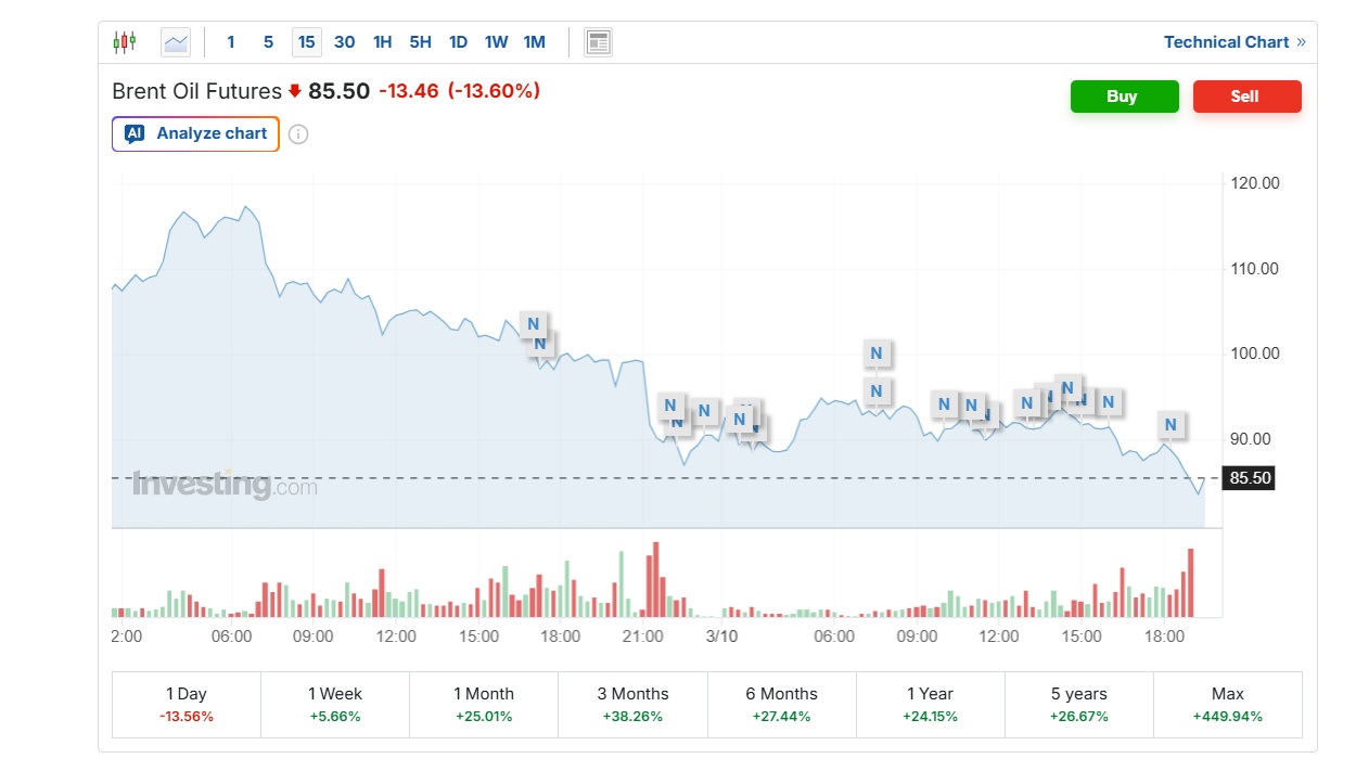 Нафта Brent падала до 82 доларів за бочку, на цю мить ціна складає 85,5 дол. Зниження становить понад 13%. Американська WTI впала до приблизно 84 доларів з баррель.