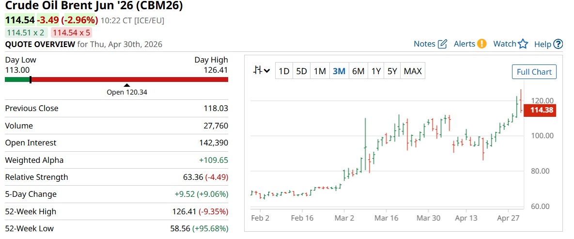 Ціна нафти Brent на біржі ICE в моменті перевищила 126 доларів за барель. Однак після стрибка котирування частково відіграли зростання, вже станом на другу половину дня Brent торгувалась поблизу 114–115 дол. за барель.