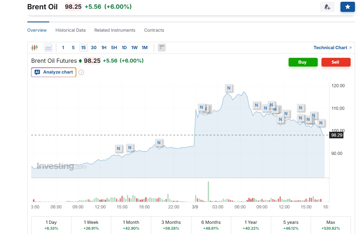 Ринкові дані показують, що ціни на нафту Brent з початку війни проти Ірану зросли майже на 40% і вперше за чотири роки перевищили позначку у 100 доларів за бочку. Упродовж дня 9 березня ціна коливалась від 98 до 119,46 доларів.