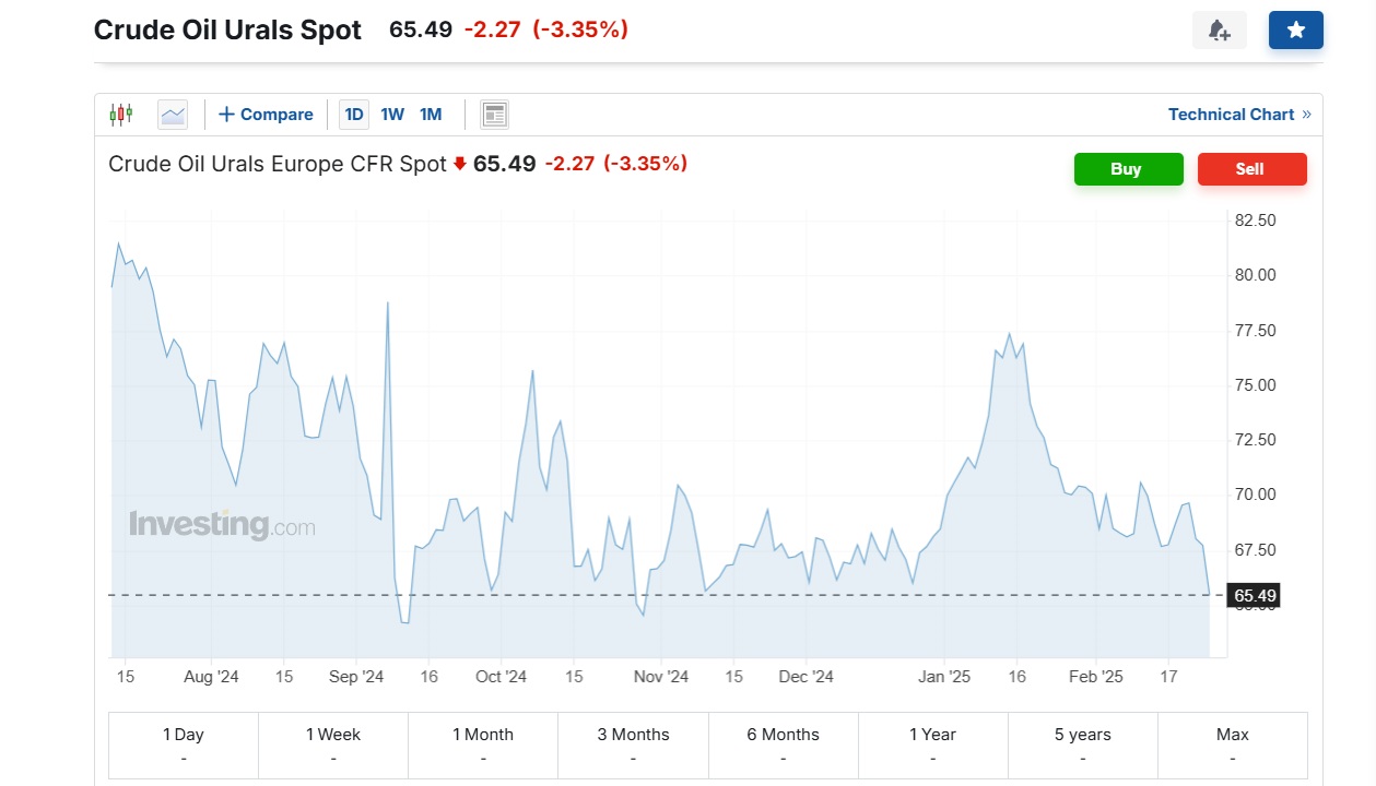 Спотова ціна Urals 7 квітня складає 65,49 доларів за баррель.