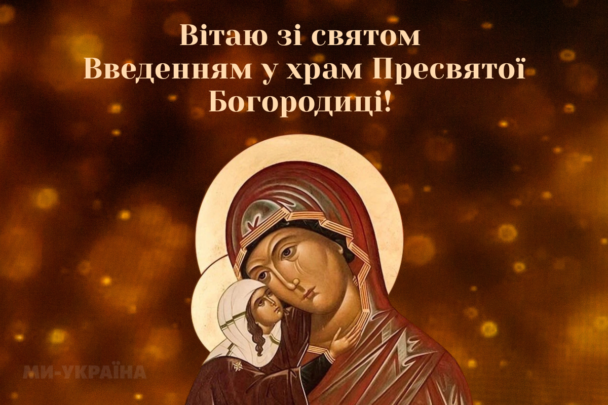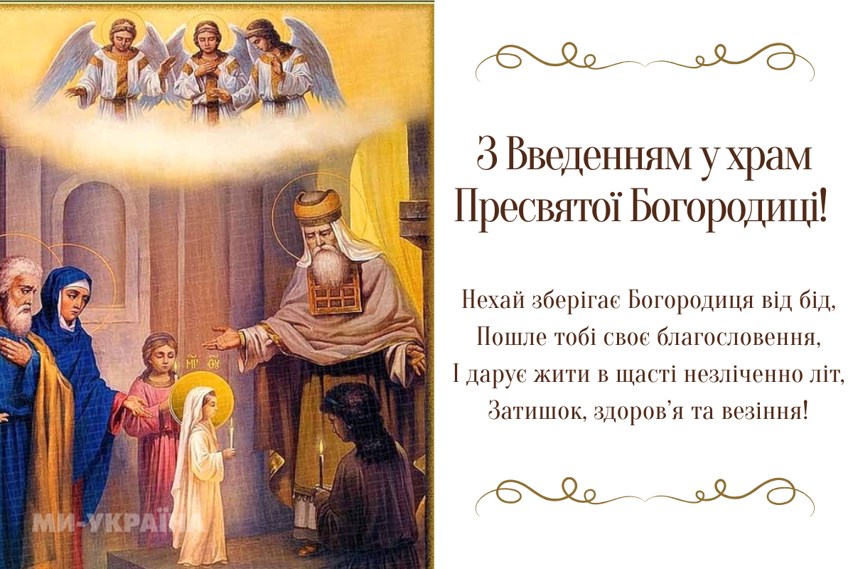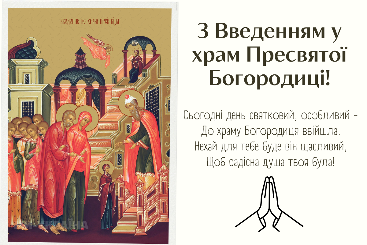Вітаю з Введенням у храм Пресвятої Богородиці! Бажаю здоров’я, Божої благодаті та миру в душі. Нехай Пресвята Богородиця дарує свою опіку, підтримку й захист, а серце завжди буде відкритим для любові та милосердя!