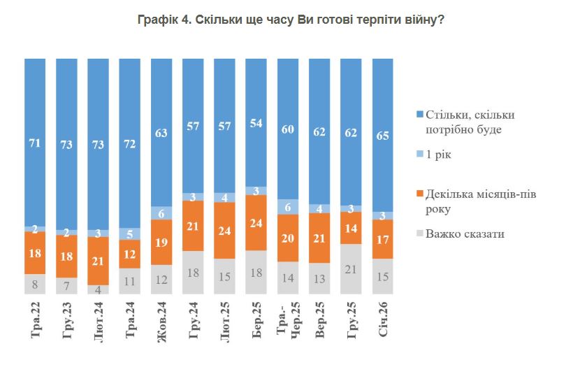 Більшість (65%) українців заявили, що готові терпіти війну стільки, скільки буде потрібно для досягнення прийнятного результату.