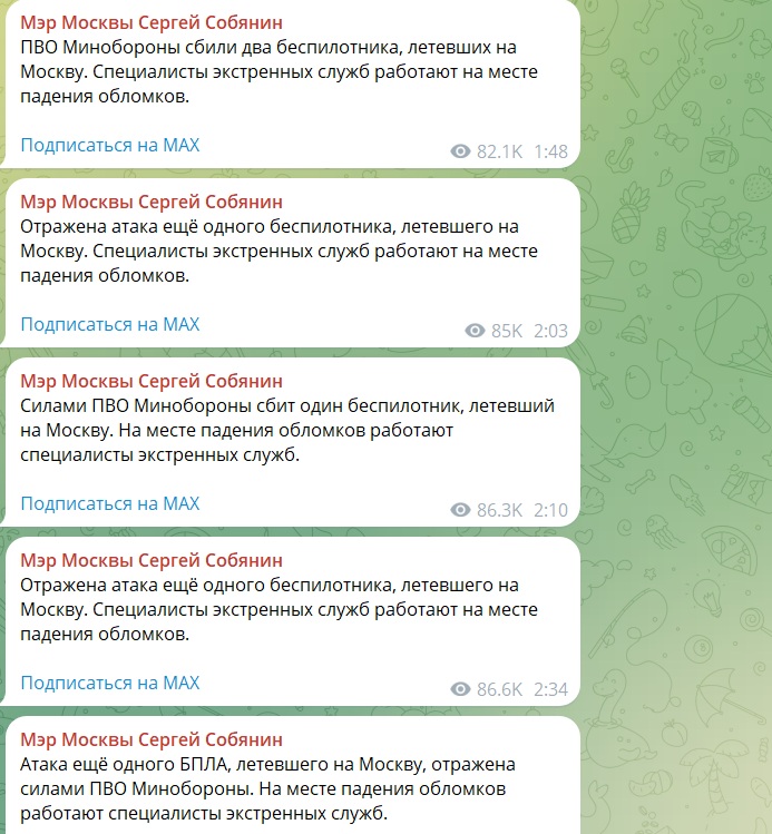 У ніч на 27 жовтня мер Москви Сергій Собянін опублікував цілу серію дописів про "збиття" дронів, які летіли на місто. За його даними, російська ППО нібито знищила збила понад 30 БпЛА в цьому регіоні. Дописи Собяніна з'являлися практично щогодини - з 16:41 26 жовтня до 02:47 27 жовтня. У кожному з них мер писав, що "на місці падіння уламків працюють фахівці екстрених служб".