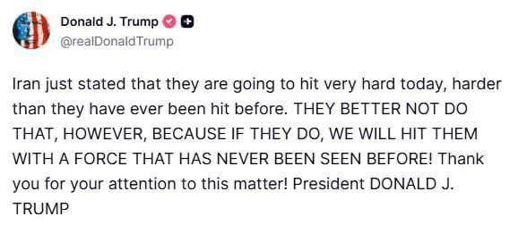 "Іран щойно заявив, що збирається завдати дуже потужного удару сьогодні – сильнішого, ніж по них коли-небудь завдавали раніше. Вони не повинні цього робити, бо якщо вони це зроблять, ми вдаримо по ним з силою, якої світ ще не бачив!", – сказав очільник Білого дому.