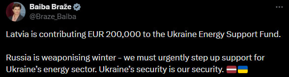 "Латвія виділяє 200 000 євро на Фонд енергетичної підтримки України. росія використовує зиму як зброю – ми маємо терміново посилити підтримку енергетичного сектору України. Безпека України – це наша безпека", – написала очільниця МЗС.