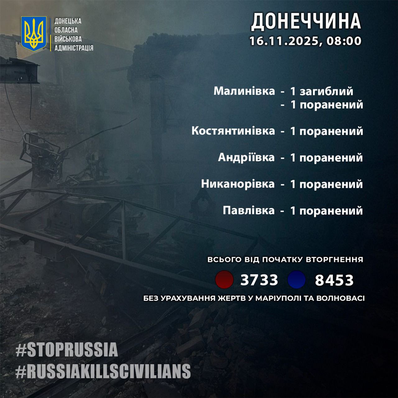 Протягом 15 листопада російська окупаційна армія завдавала нових ударів по населених пунктах Донеччини. У селі Малинівка загинув один цивільний. Крім того, ще п’ятеро людей отримали різні поранення внаслідок чергових обстрілів.