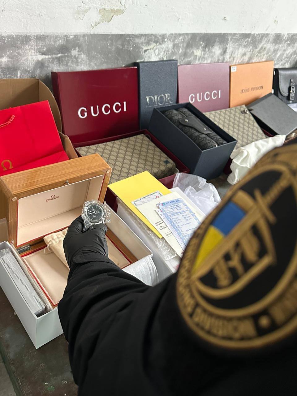 Під час огляду транспортного засобу, який їхав через “зелений коридор”, працівники митниці виявили значну кількість незадекларованих сумок, гаманців і взуття. Серед вилучених речей - продукція Goyard, Louis Vuitton, Gucci, Dior, Brunello Cucinelli, а також швейцарські годинники Omega SA.