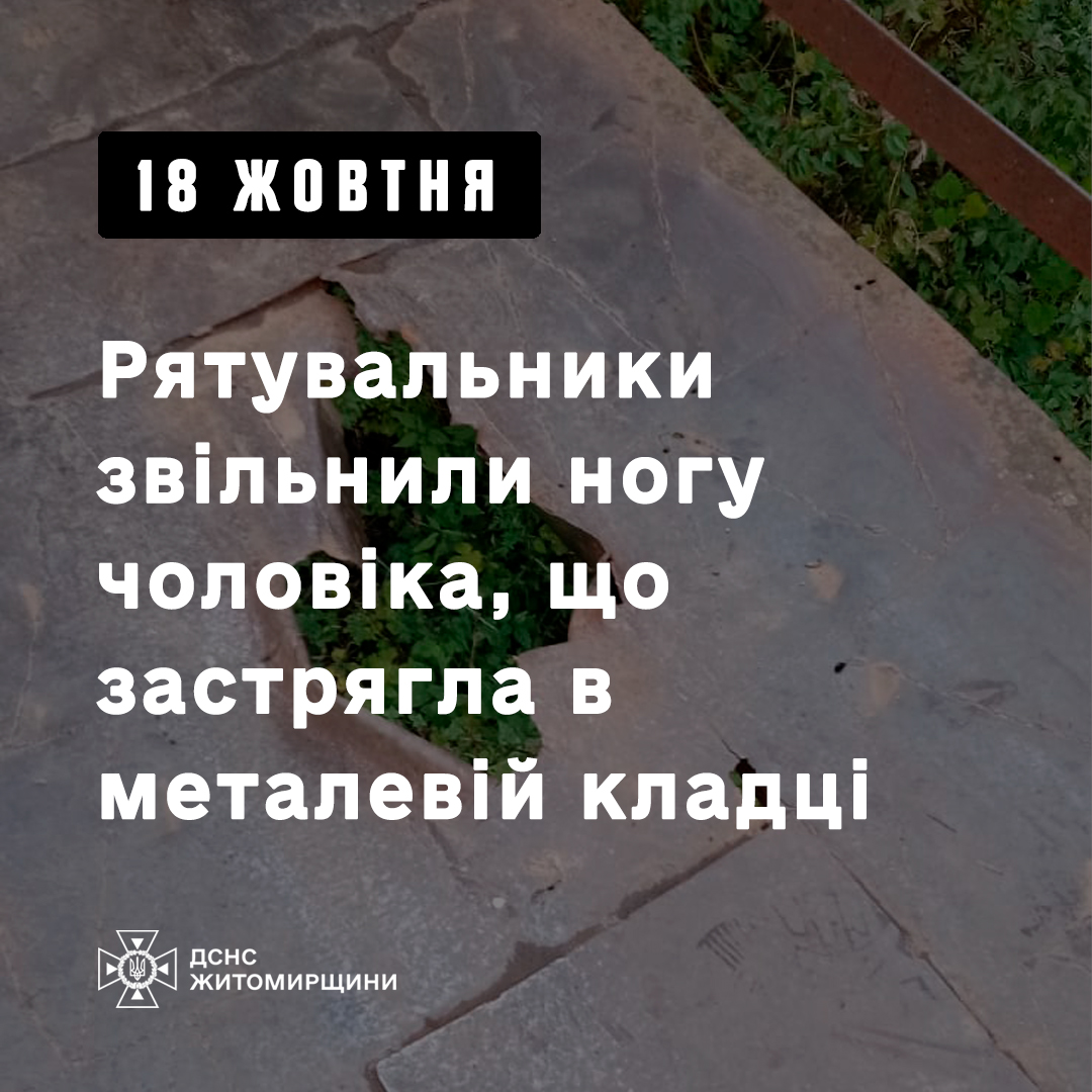 Поблизу села Станишівка Житомирського району ввечері 18 жовтня стався інцидент з 60-річним чоловіком - його нога застрягла в металевій кладці через річку Тетерів.