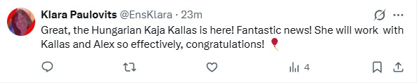 "Чудово, угорська Кая Каллас вже тут! Фантастичні новини! Вона так ефективно працюватиме з Каллас та Алексом, вітаємо", - написав один з них.