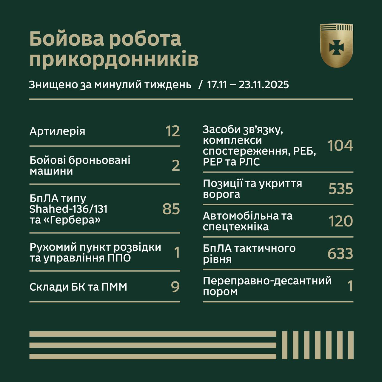 Українські прикордонники за тиждень з 17 по 23 листопада уразили 535 позицій та укриттів росіян.