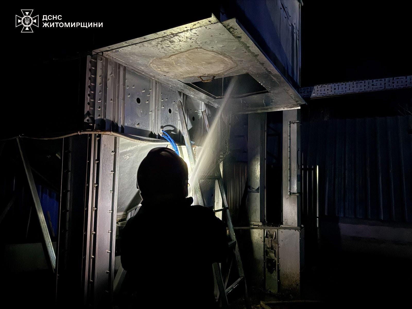 На Житомирщині вночі виникла пожежа в зерносушарці, її загасили рятувальники.