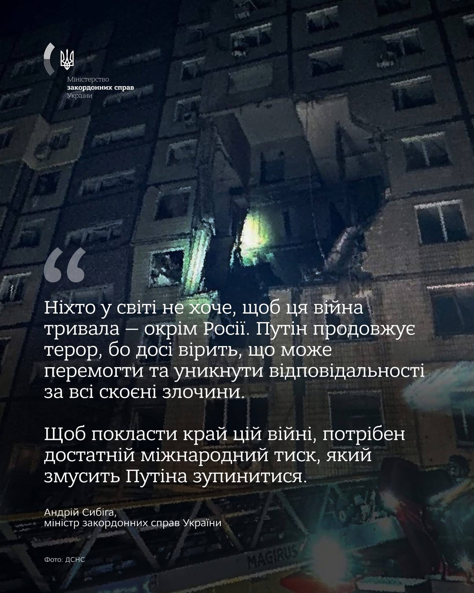 "Російські удари знову були спрямовані проти мирного життя людей. Вони позбавили громади електроенергії, води та опалення, знищили критичну інфраструктуру й пошкодили залізничні мережі. Ніхто у світі не хоче, щоб ця війна тривала - окрім росії", - наголосив Сибіга.