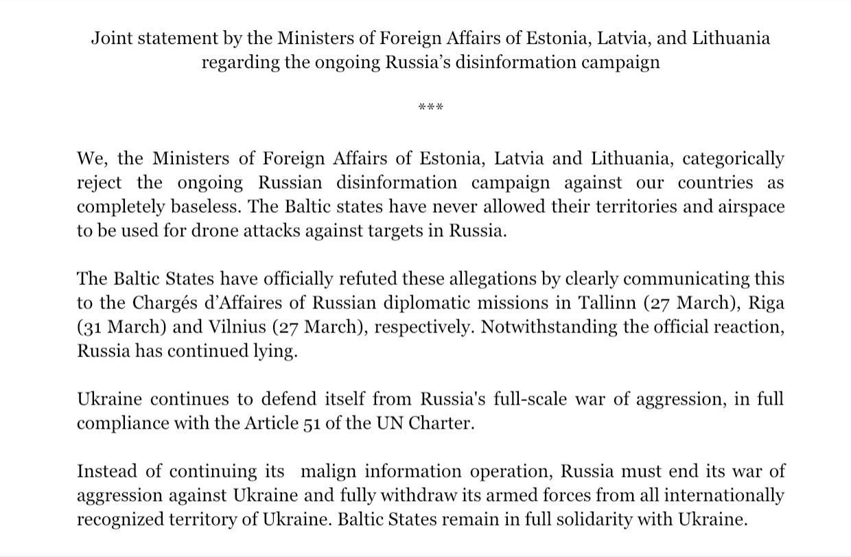 Зокрема мова йде про спільну заяву очільників зовнішньополітичних відомств Естонії, Латвії і Литви щодо вкидів Москви про українські дрони, які порушують повітряний простір країн Балтії.