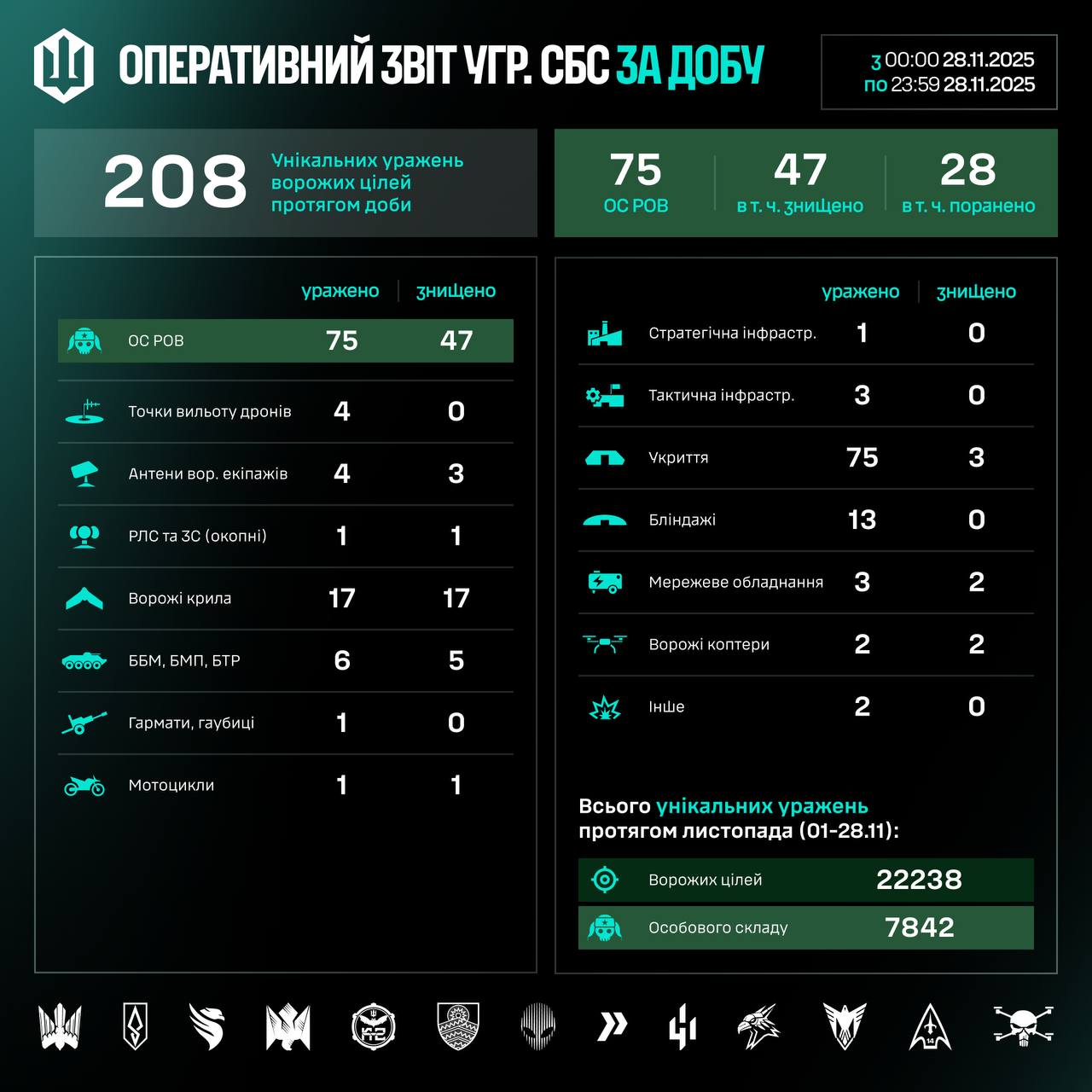 Сили безпілотних систем ЗСУ (СБС) за добу 28 листопада уразили або знищили 208 російських цілей.