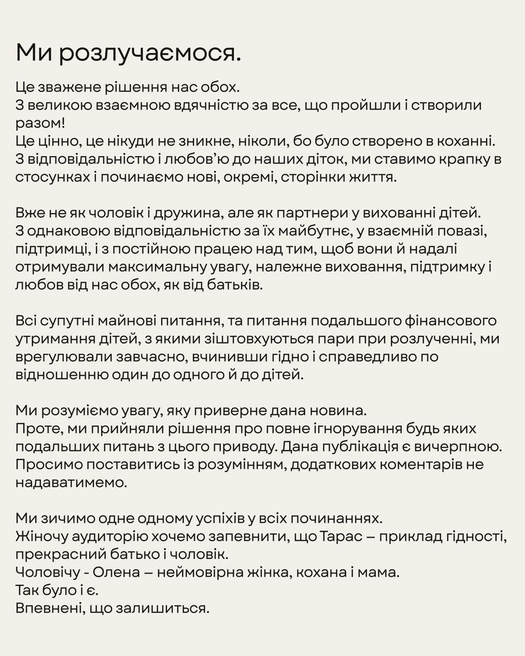 "Ми зичимо одне одному успіхів у всіх починаннях. Жіночу аудиторію хочемо запевнити, що Тарас – приклад гідності, прекрасний батько і чоловік. Чоловічу – Олена – неймовірна жінка, кохана і мама. Так було і є. Впевнені, що залишиться", - написали у заяві.