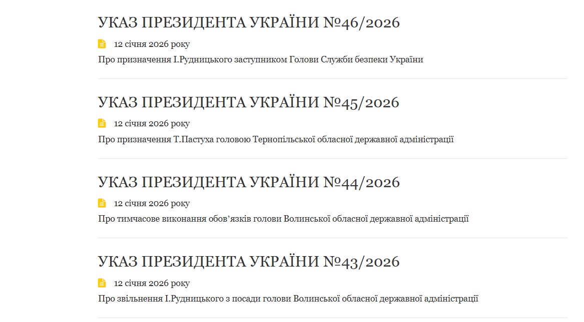 Президент Володимир Зеленський 12 січня підписав низку кадрових указів щодо керівництва обласних держадміністрацій і Служби безпеки України.
