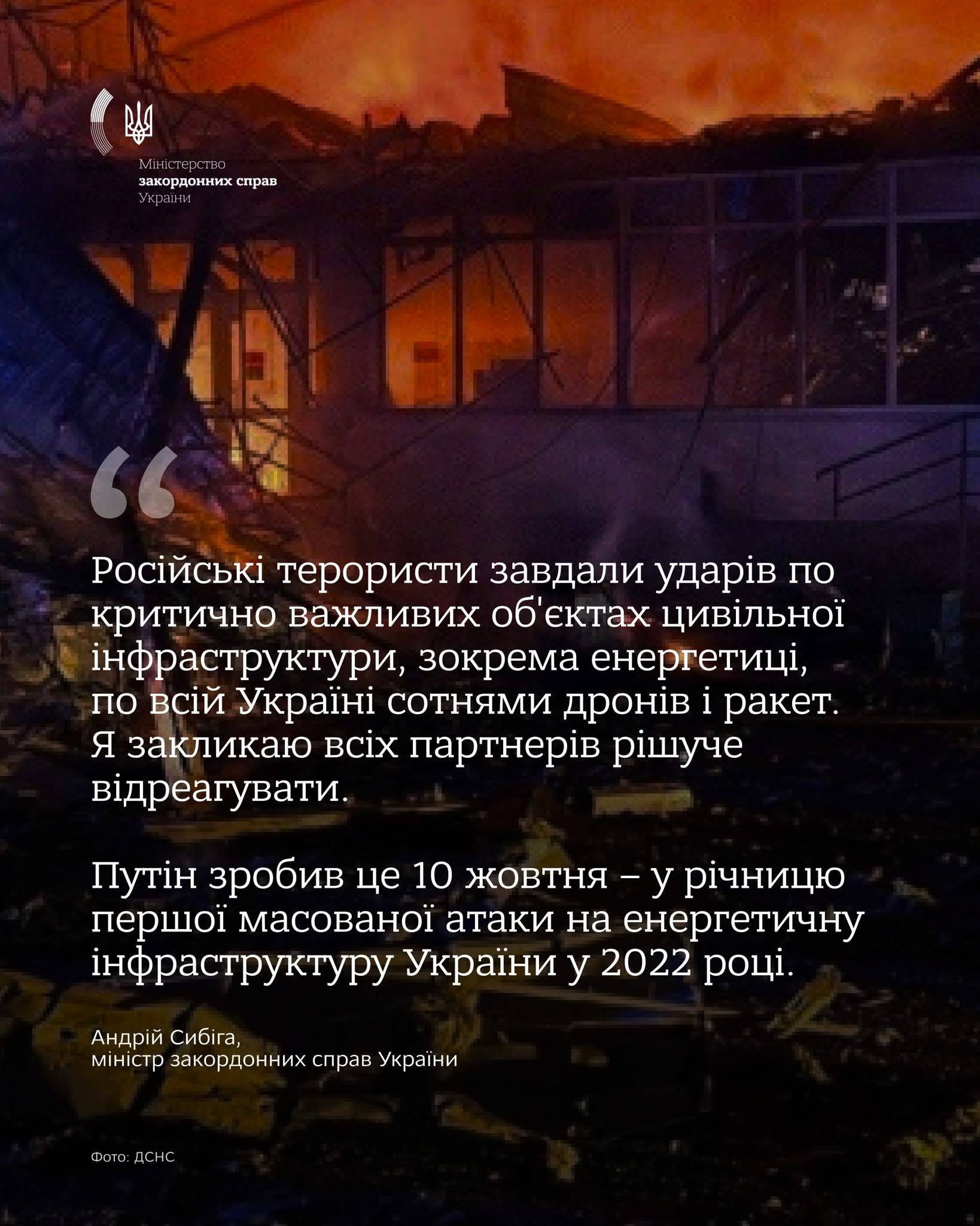 "Російські терористи завдали ударів по критично важливих об'єктах цивільної інфраструктури, зокрема енергетиці, по всій Україні сотнями дронів і ракет. Закликаю всіх партнерів рішуче відреагувати", - заявив Сибіга.
