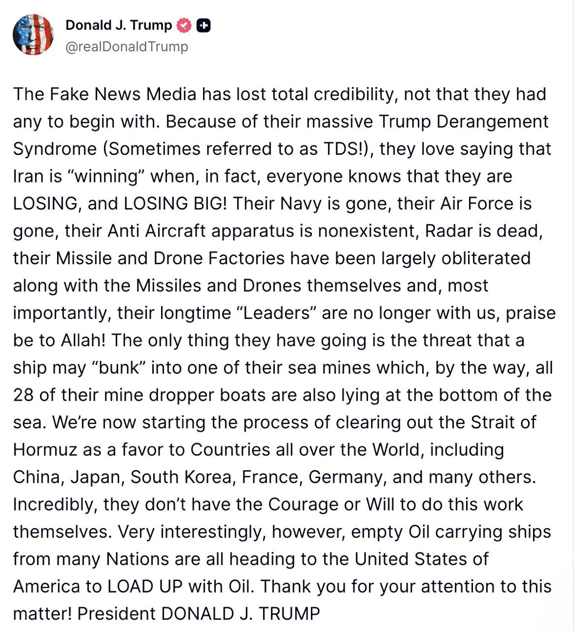 "Єдине, що у них залишилося, це загроза того, що корабель може "наїхати" на одну з їхніх морських мін, які, до речі, всі 28 їхніх мінних катерів також лежать на дні моря. Зараз ми починаємо процес очищення Ормузької протоки як послугу країнам усього світу", - заявив американський лідер.
