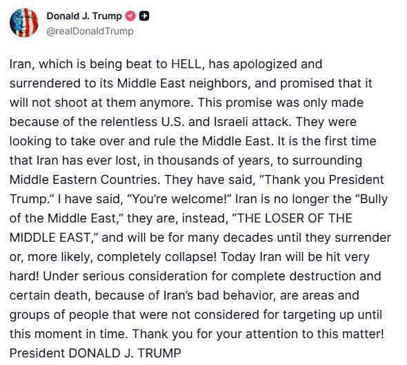 "Іран, якого дуже сильно б’ють, вибачився перед своїми близькосхідними сусідами та пообіцяв більше не стріляти по них. Це сталося лише через невпинні атаки США та Ізраїлю", - написав він.