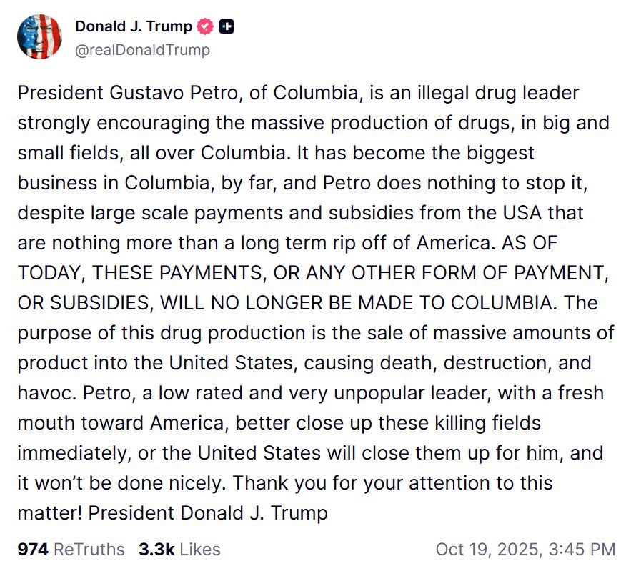 "Президент Колумбії Густаво Петро є лідером незаконного наркобізнесу, який активно заохочує масове виробництво наркотиків – на великих і малих плантаціях по всій Колумбії", – написав президент США.