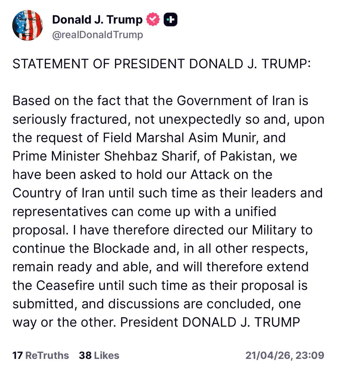 "Виходячи з того факту, що уряд Ірану серйозно розколотий, що цілком несподівано, і на прохання фельдмаршала Асіма Муніра та прем'єр Пакистану Шехбаза Шаріфа, нас попросили призупинити наш напад на країну Іран доти, доки їхні лідери та представники не зможуть запропонувати єдину пропозицію. Тому я наказав нашим військовим продовжувати блокаду та в усіх інших аспектах залишатися готовими та боєздатними, і тому продовжу припинення вогню доти, доки їхня пропозиція не буде подана, а обговорення не завершаться тим чи іншим чином", - написав він.