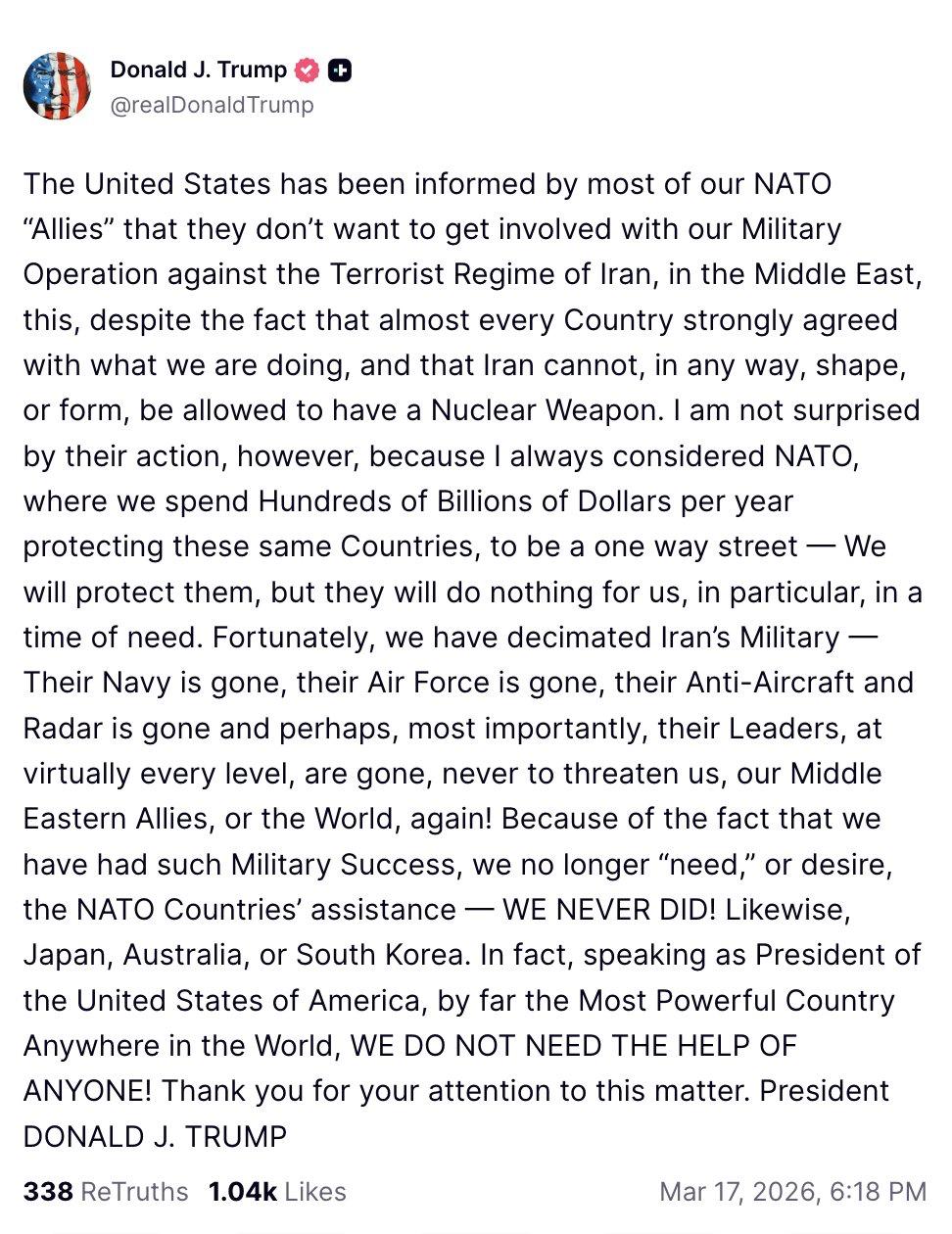 Він також заявив про повну військову перемогу над Іраном - знищення армії, флоту, Повітряних сил, ППО і радарів. За його словами, після такого успіху США більше не потребують допомоги жодних союзників - ні НАТО, ні Японії, ні Австралії, ні Південної Кореї.