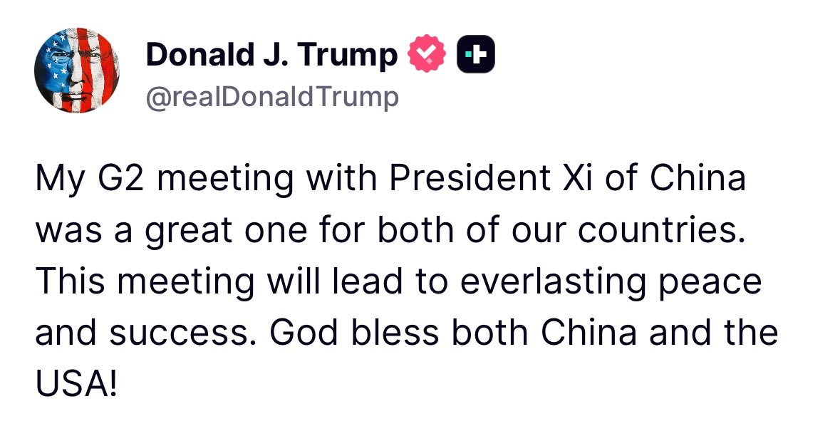 "Моя зустріч на рівні G2 із президентом Сі Цзіньпіном з Китаю була відмінною для обох наших країн. Ця зустріч приведе до вічного миру та успіху. Нехай Бог благословить як Китай, так і США", - заявив він.