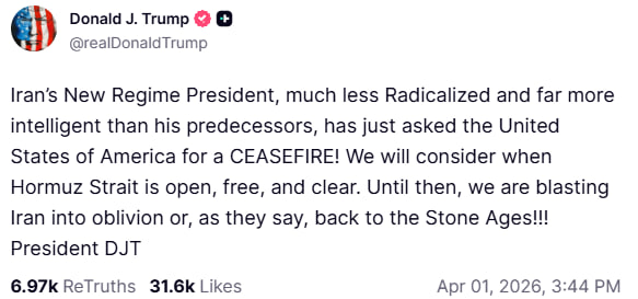 Очільник Білого дому підкреслив, що Сполучені Штати готові розглянути перемир’я, однак висунув умову – відновлення безпечного судноплавства в Ормузькій протоці. У разі відсутності прогресу, Вашингтон готовий діяти жорстко – "знищити Іран дощенту" або "відправити його назад у кам’яний вік".