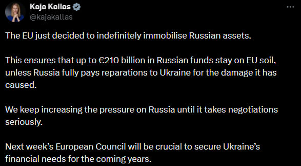 "ЄС ухвалив рішення про безстрокове замороження російських активів – це гарантує, що російські кошти на суму до 210 мільярдів євро залишаться на території ЄС, доки росія не виплатить Україні повну компенсацію за завдані збитки. Ми продовжуємо посилювати тиск, доки рф не почне серйозно ставитися до переговорів. Засідання Європейської ради наступного тижня буде вирішальним для забезпечення фінансових потреб України на найближчі роки", – написала Каллас.