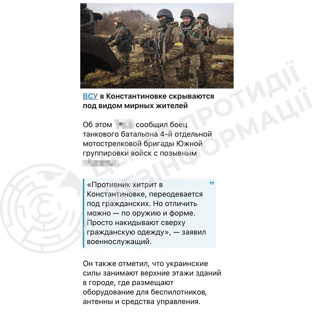 Зокрема, пропагандистські ресурси поширюють заяви про те, що українські захисники нібито маскуються під цивільних та займають житлові багатоквартирні будинки.