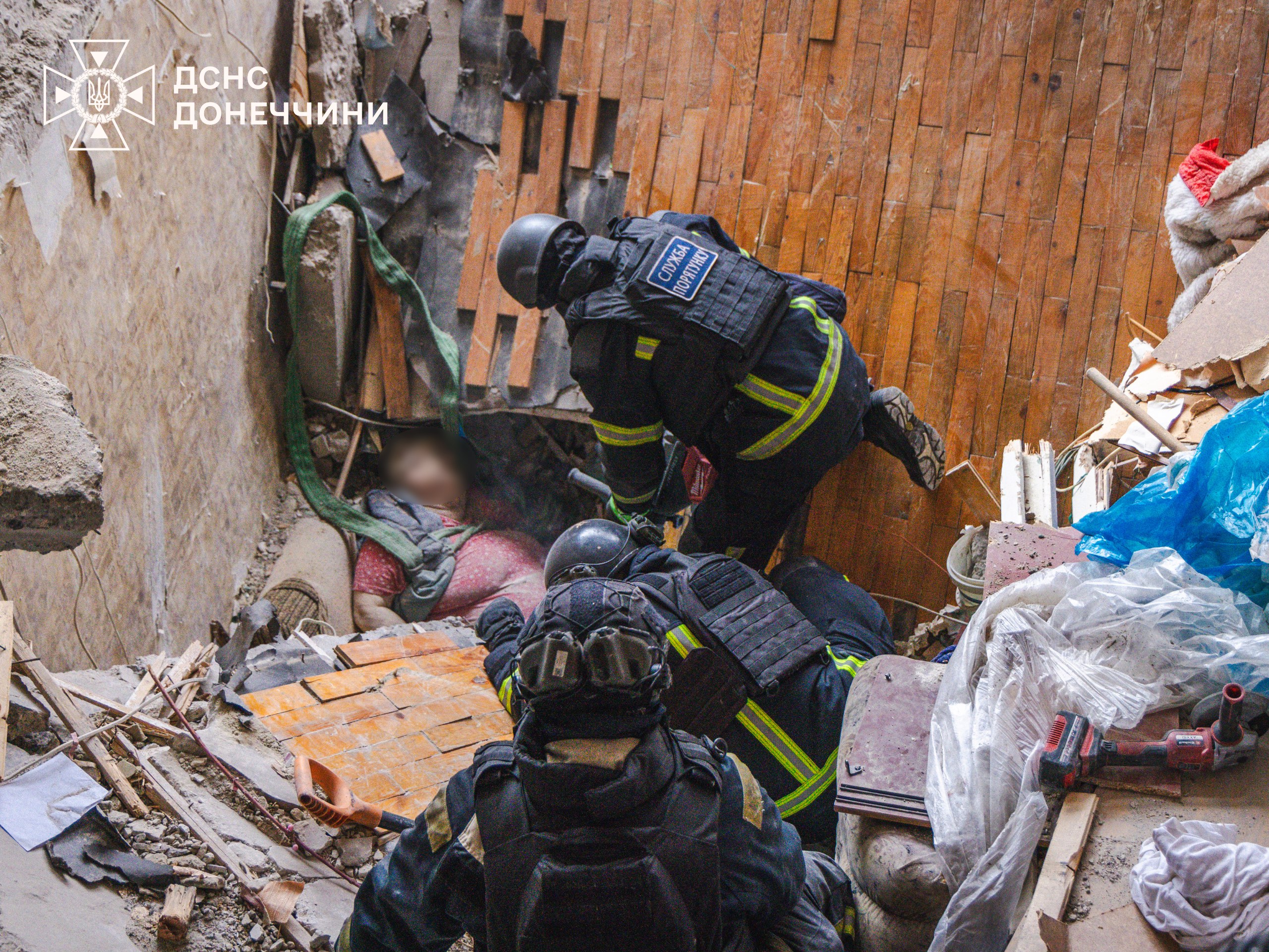 Надзвичайкам вдалось врятувати пенсіонерку, яка перебувала під завалами зруйнованих квартир другого і третього поверхів. Працівники ДСНС передали потерпілу парамедикам Нацполіції, які доставили її до медичного закладу.