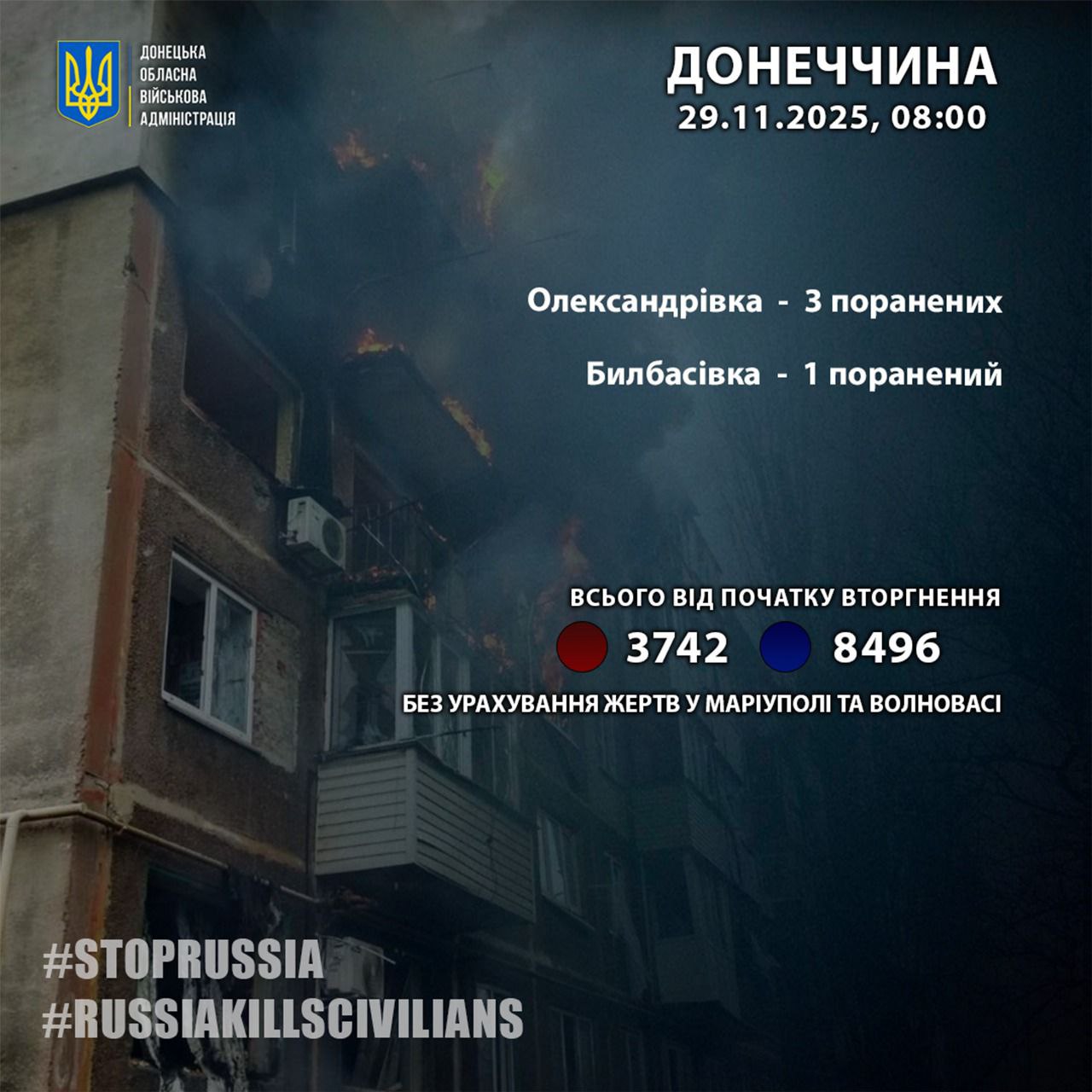 На Донеччині через російські удари, які російська армія здійснювала 28 листопада, поранення отримали четверо жителів Донеччини.