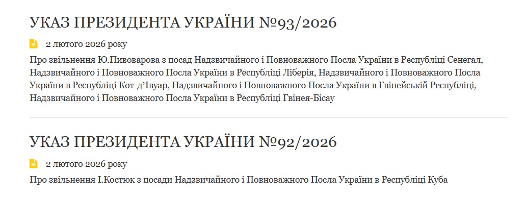 Згідно з указом №93/2026 звільнено Юрія Пивоварова з посади посла України в Сенегалі, а також із посад посла України за сумісництвом у Ліберії, Кот-дʼІвуарі, Гвінейській Республіці і Гвінеї-Бісау.