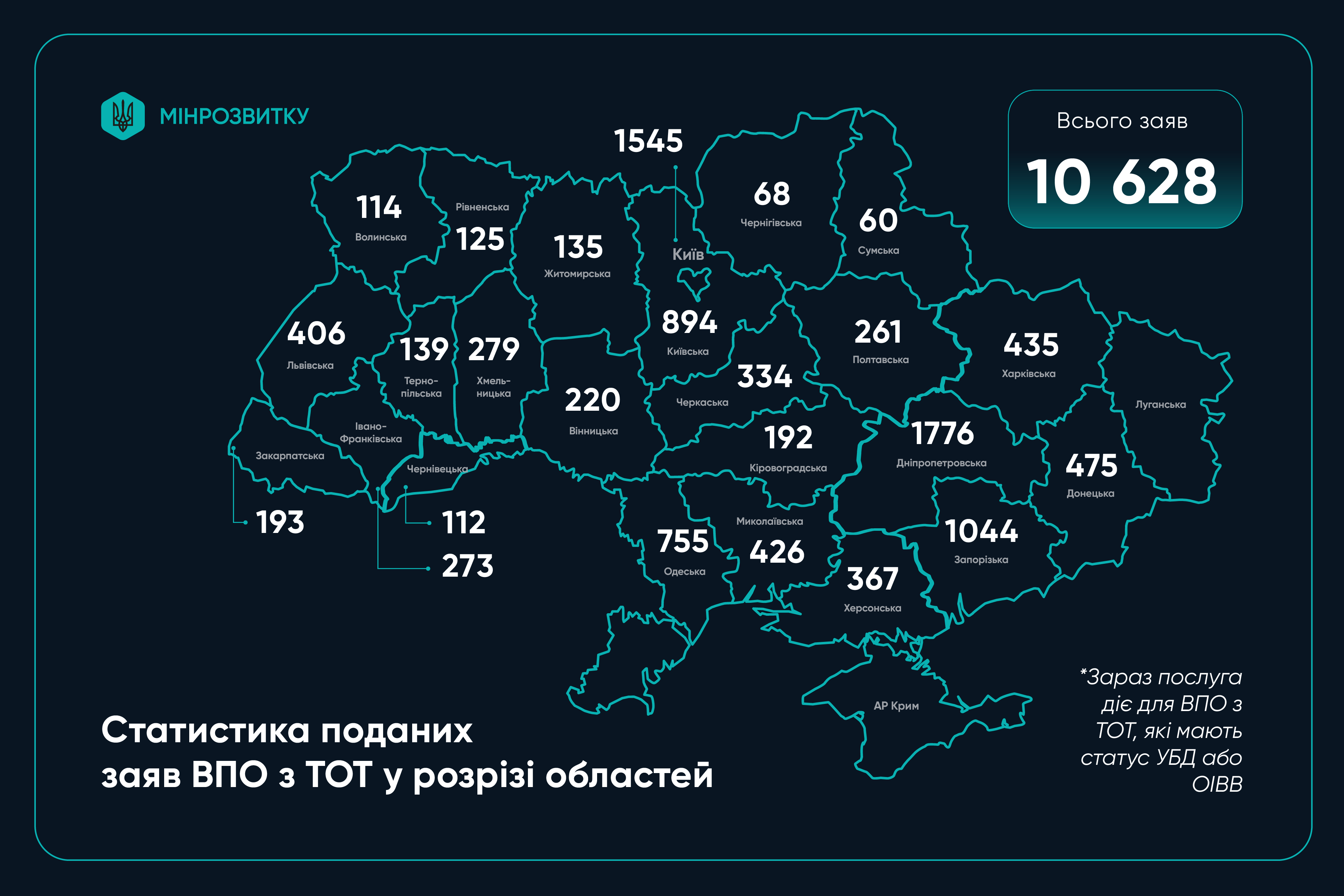 Найбільше звернень зафіксовано у Дніпропетровській області (1 776), столиці (1 545) та на Запоріжжі (1 044). Якщо ж брати до уваги регіони походження заявників, то найактивніше звертаються переселенці з Донецької (3 566 заяв), Луганської (3 127), Запорізької (2 067) та Херсонської (1 601) областей.