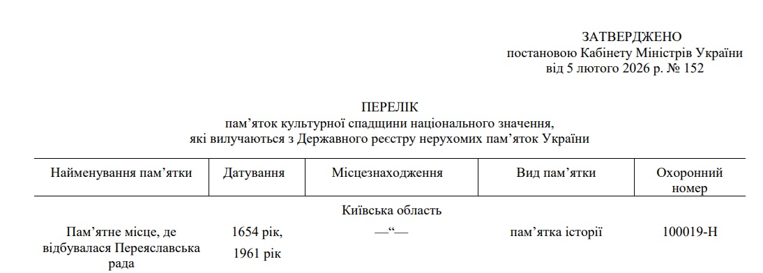 Кабінет Міністрів вилучив пам’ятне місце, де відбувалася Переяславська рада, з Держреєстру нерухомих пам’яток України. Відповідне рішення закріплене постановою №152 від 5 лютого 2026 року.