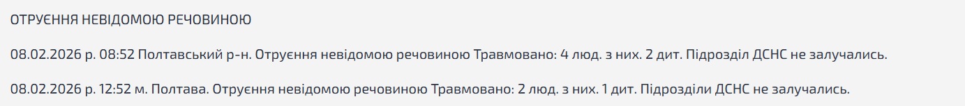 За оперативною інформацією ГУ ДСНС у Полтавській області, протягом доби з 00:00 8 лютого до 00:00 9 лютого 2026 року в області зафіксували кілька інцидентів, які класифікували як отруєння невідомою речовиною.