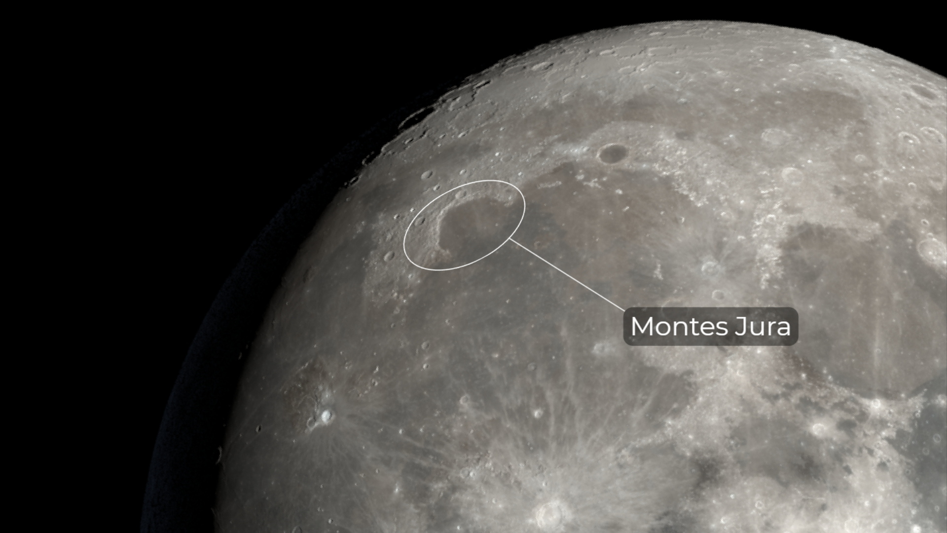гірський хребет Монтес-Жура обрамляє місце з поетичною назвою "Затока Веселки" (Синус-Іридум). Через 11 днів після новолуння (якраз зараз!) верхівки цих гір ловлять сонячне світло особливим чином. Світяться тільки піки, а довкола темрява - виглядає так, ніби на Місяці лежить гігантська золота ручка.