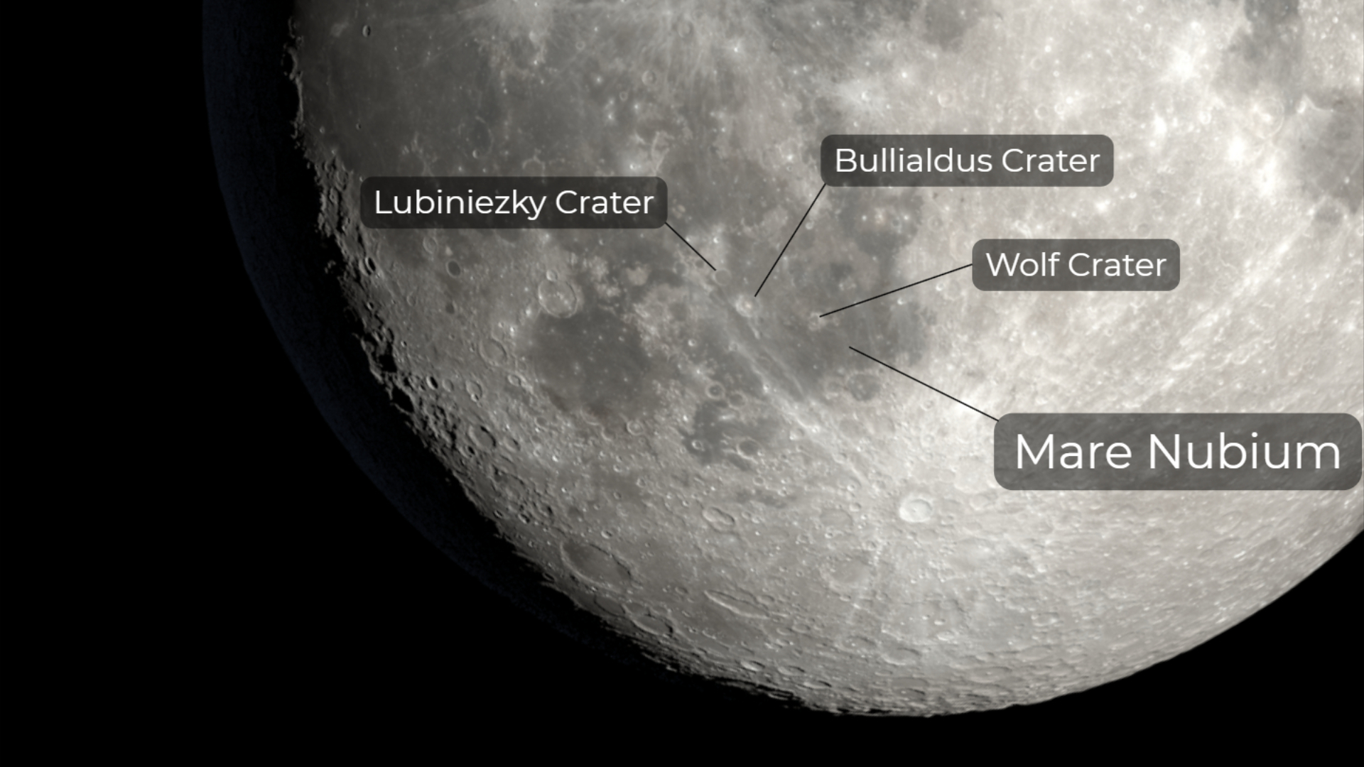 Трохи нижче центру Місяця розташована темна пляма - Mare Nubium, що латиною означає "Море хмар". Але ніякої води там немає — це величезна рівнина з застиглої лави.