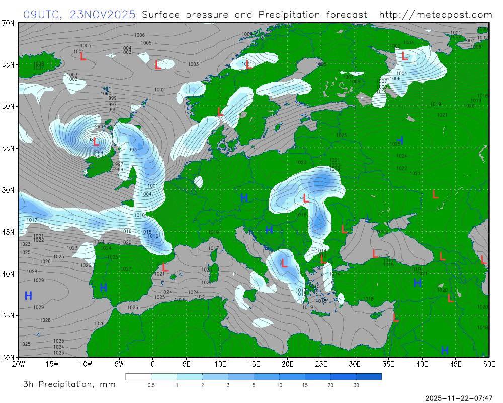 У Києві 23 листопада Діденко прогнозує хмарну і вогку погоду, вдень до +7°C, а ввечері потеплішає до +9°C.