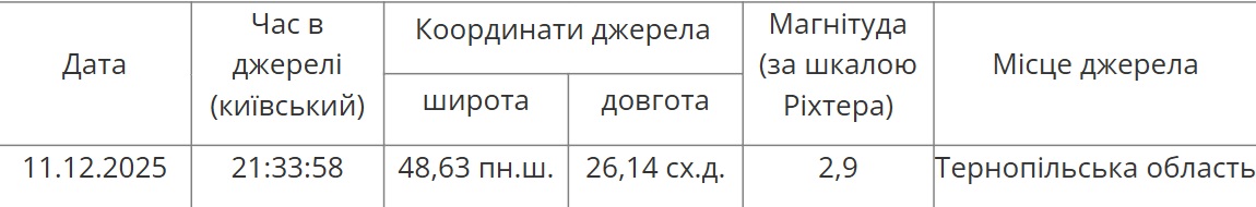 В Україні 11 грудня було зафіксовано землетрус магнітудою 2,9 за шкалою Ріхтера. Про це інформує Головний центр спеціального контролю.