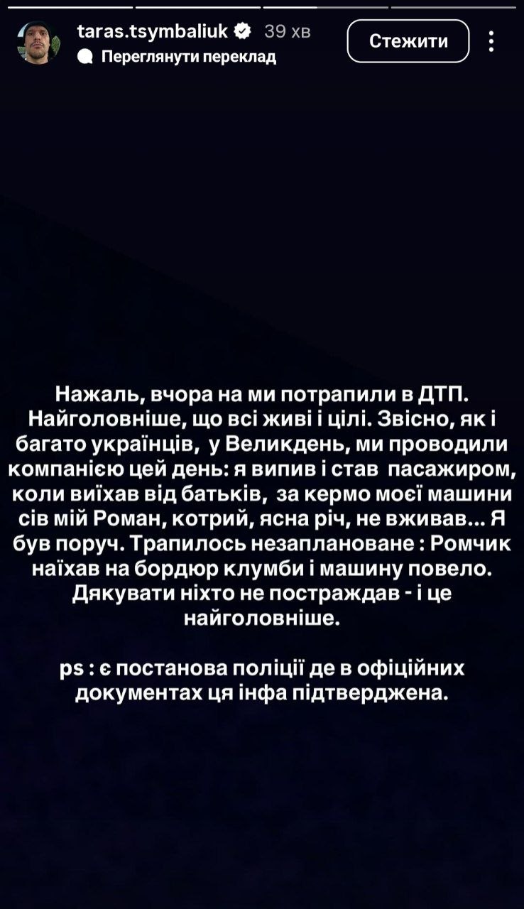 "На жаль, вчора ми потрапили у ДТП. Найголовніше, що всі живі і цілі. Звісно, як і багато українців, у Великдень, ми проводили компанією цей день: я випив і став пасажиром, коли виїхав від батьків, за кермом моєї машини сів мій Роман, котрий, ясна річ, не вживав... Я був поруч. Трапилось незаплановане: Ромчик наїхав на бордюр клумби і машину повело. Дякувати, ніхто не постраждав – і це найголовніше. Є постанова поліції, де в офіційних документах ця інформація підтверджена", – написав він.