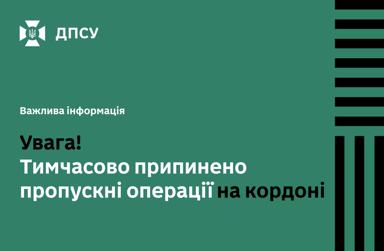 Державна прикордонна служба України повідомляє про тимчасове припинення пропускних операцій на кордоні.