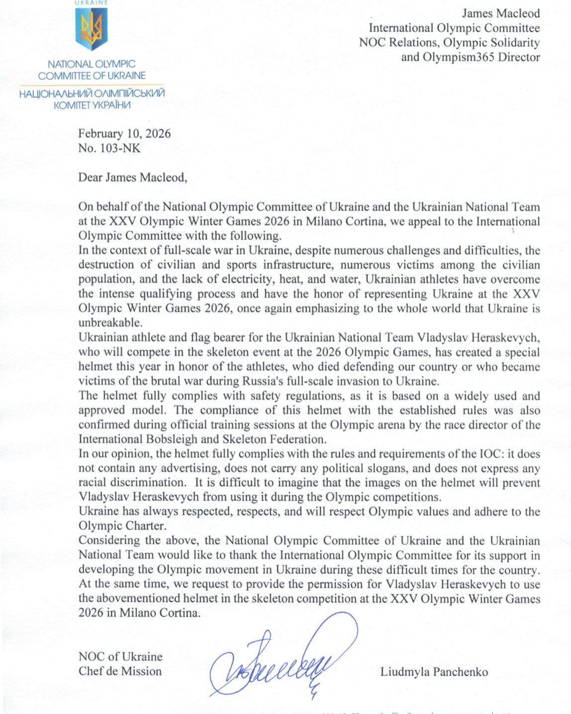 Національний олімпійський комітет України офіційно звернувся до Міжнародного олімпійського комітету (МОК) щодо дозволу використання "шолома пам’яті" Владиславом Гераскевичем на зимових Олімпійських іграх 2026 року в Мілані-Кортіні.